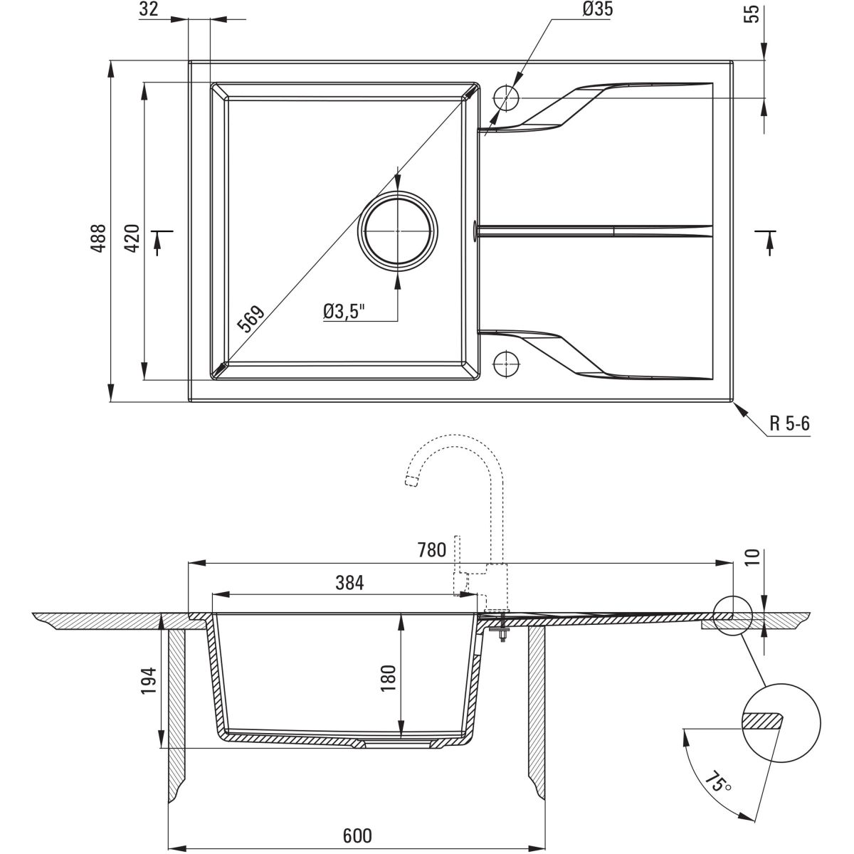 - Abflussdurchmesser: 3,5''