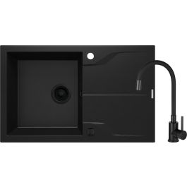 Die Granitspüle mit Wasserhahn bildet ein komplettes Set für die Küche. Sie wurde aus strapazierfähigem, natürlichem Granit hergestellt, der nicht nur gegen hohe Temperaturen und Temperaturschwankungen, sondern auch gegen Stöße und Verfärbungen gemäß der europäischen Norm PN-EN 13310 beständig ist. Darüber hinaus wurde er mit einer wasserabweisenden Schicht versehen, die das Abfließen einzelner Tropfen erleichtert. In derselben Farbgebung ist auch die Armatur mit einem praktischen Auslauf erhältlich. Die praktische 1-Kammer-Spüle mit Abtropffläche ist die perfekte Lösung für kleine Küchen und Einzimmerwohnungen mit Kochnische. Sie dient gleichzeitig als Trockner, da die profilierte Oberfläche das von Geschirr oder gewaschenen Lebensmitteln abfließende Wasser effizient ableitet.