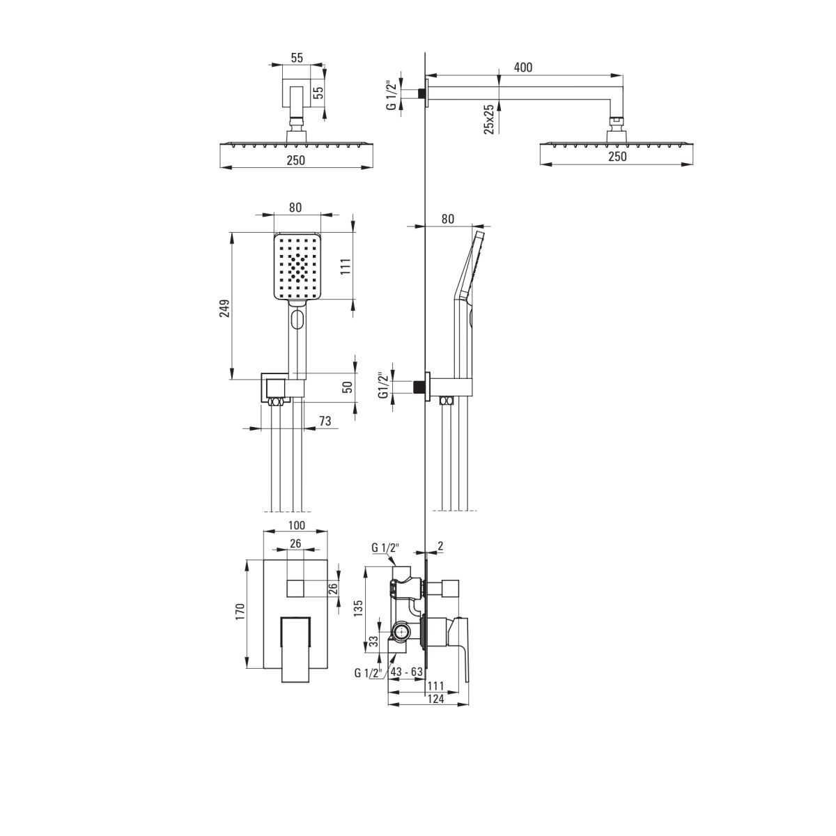 Die Unterputz-Duschgarnitur in glänzendem Chrom stammt aus der Kollektion Anemon Bis. Die Hauptmerkmale dieser Kollektion sind ausgewogene Proportionen, klare Linien und eine kubistische Form. Das Set besteht aus einer Mischbatterie, einer Handbrause, einem Handbrausehalter, einem PVC-Schlauch und einem Duschkopf. Die Mischbatterie verfügt über einen mechanischen Strahlumschalter, mit dem die Wasserzufuhr zwischen Handbrause und Duschkopf umgeschaltet werden kann. Die Handbrause hat 3 Strahlfunktionen: Regenstrahl, Wassernebel und Mischstrahl. Der große quadratische Duschkopf ist aus Messing gefertigt und verfügt über ein Anti-Kalk-System, das die Reinigung von Ablagerungen und Kalk erleichtert.