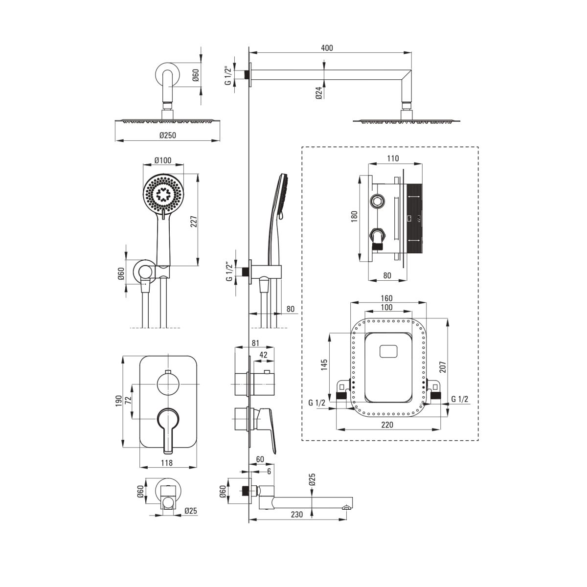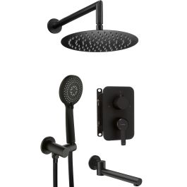 Das Arnika-Set besteht aus einer Unterputz-Mischbatterie, einer Duschbrause, einem beweglichen Auslauf und einer Handbrause mit Schlauch und Winkelanschluss. Die Box zeichnet sich durch eine einfache Montage und ein minimalistisches Design aus. Die Duschbrause ist sehr dünn und aus hochwertigem Edelstahl gefertigt. Der bewegliche Auslauf kann parallel zur Wand geklappt werden, was besonders bei kleinen Kindern nützlich ist. Der Winkelanschluss verfügt über einen einstellbaren Neigungswinkel der Handbrause, sodass sie an die individuellen Vorlieben des Benutzers angepasst werden kann. Das gesamte Set ist in mattem Schwarz gehalten.