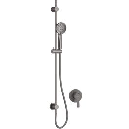 Das Duschset Arnika besteht aus einer Unterputzarmatur und einer Handbrause, die an einer eleganten Stange befestigt ist. Der Messinggriff der Handbrause ist beweglich und kann in jede beliebige Position gebracht werden. Die Handbrause verfügt über drei Strahlarten: Regenstrahl, Mischstrahl und Hydromassage sowie ein Anti-Kalk-System, das die Reinigung erleichtert. Die Armatur ist in einer auffälligen Titanfarbe gehalten, die einen Kompromiss zwischen Grau, Dunkelgrau, Schwarz und Braun darstellt.