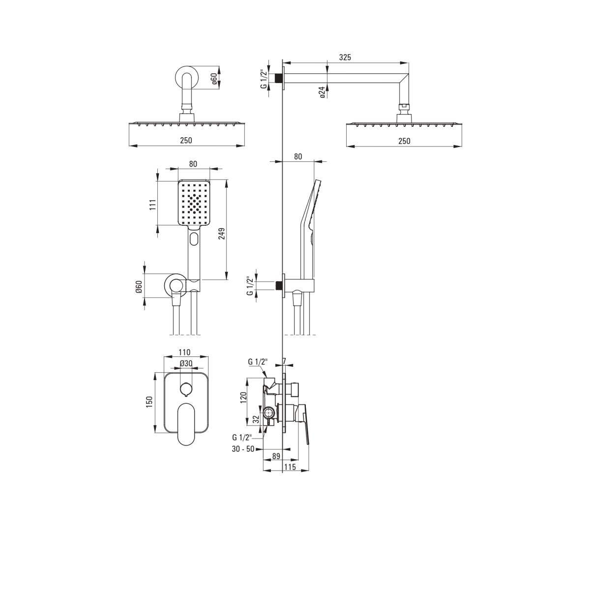- Inbegriffen: Batterie mit Schalter, Duschkopf, Duschkopf, Duschschlauch, Eckanschluss