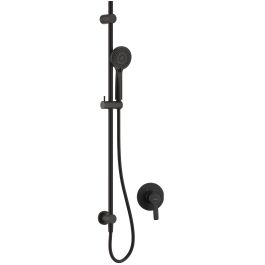 Das Unterputz-Set Arnika umfasst eine Handbrause mit Schlauch, die an einer stilvollen Stange befestigt ist, sowie eine Unterputzarmatur. Der Messinggriff der Handbrause kann in jede beliebige Position verschoben werden. Die Einhebelarmatur verfügt über einen komfortablen Hebel und einen Keramikkopf. Das gesamte Set ist in elegantem, mattem Schwarz gehalten.