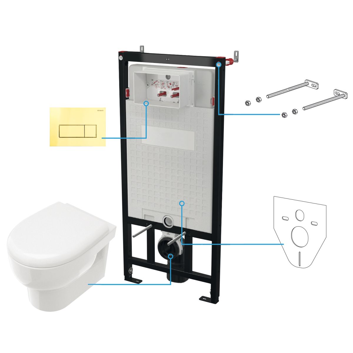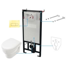 Das WC-Set für die Unterputzmontage besteht aus einer Avis-Toilettenschüssel mit Sitz, einem Unterputzrahmen für Wandtoiletten und einem Spülknopf in Goldoptik. Die flanschlose Avis-Toilettenschüssel hat keine Ecken und Kanten, was die Reinigung erheblich erleichtert. Die verwendete Technologie gewährleistet eine gründliche Spülung mit wenig Wasser. Die Toilettenschüssel wird mit einem Soft-Close-Sitz geliefert. Der Rahmen verfügt über eine leise Doppelspülung – klein (3 l) und groß (6 l). Er kann in einer Leichtbaukonstruktion oder vor einer Wand montiert werden. Der Knopf in Goldoptik verleiht dem Badezimmer einen Hauch von Extravaganz. Durch seine flache Konstruktion schmiegt sich der Knopf perfekt an die Wand an und ist gleichzeitig leicht zu reinigen.