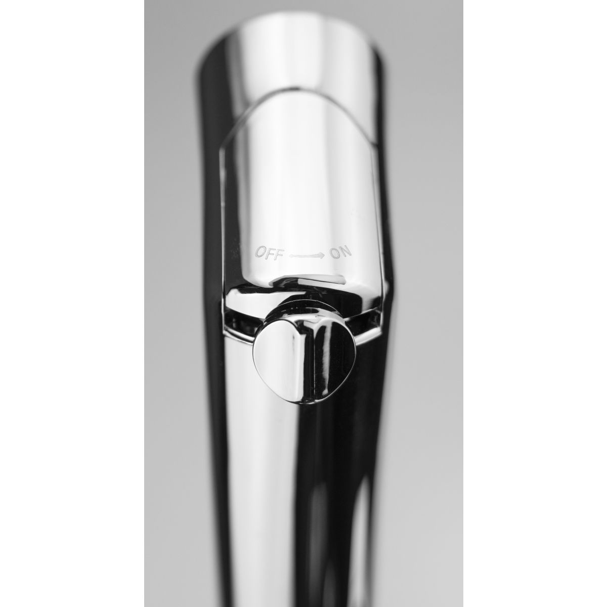 Die Handbrause mit Punktgriff, glänzend verchromt, verfügt über eine Start-Stopp-Funktion, mit der der Wasserfluss mit einem einzigen Schieber gesteuert werden kann. Durch Verschieben des Elements entlang der Achse wird die Wassermenge erhöht, wobei der Strahl entsprechend den Markierungen „OFF” und „ON” ein- und ausgeschaltet wird. Das Produkt ist ideal für den Einsatz im Badezimmer und sorgt für Komfort und Hygiene.