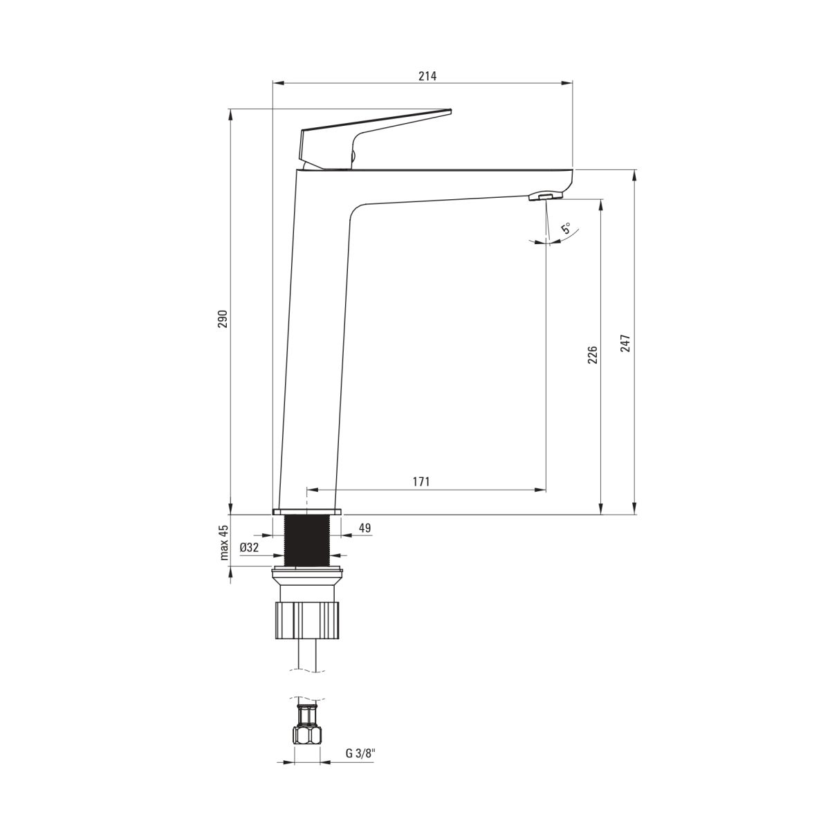 - Gewinde von der Installation: 3/8''