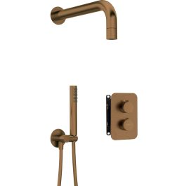 Das Duschset ist eine perfekte Kombination aus modernem Design, Funktionalität und Komfort. Dank des Thermostatsystems sorgt es für eine präzise Temperaturregelung des Wassers, wodurch plötzliche Temperaturschwankungen vermieden werden und die Sicherheit beim Duschen gewährleistet ist. Durch die Unterputzmontage ist die gesamte Installation ästhetisch verdeckt, was dem Innenraum ein minimalistisches und aufgeräumtes Aussehen verleiht. Das Set besteht aus einem kleinen Duschkopf und einer ergonomischen Handbrause mit Schlauch und Winkelanschluss. Der Duschkopf sorgt für einen optimalen kegelförmigen Wasserstrahl. Das Ganze ist in elegantem gebürstetem Bronze gehalten.