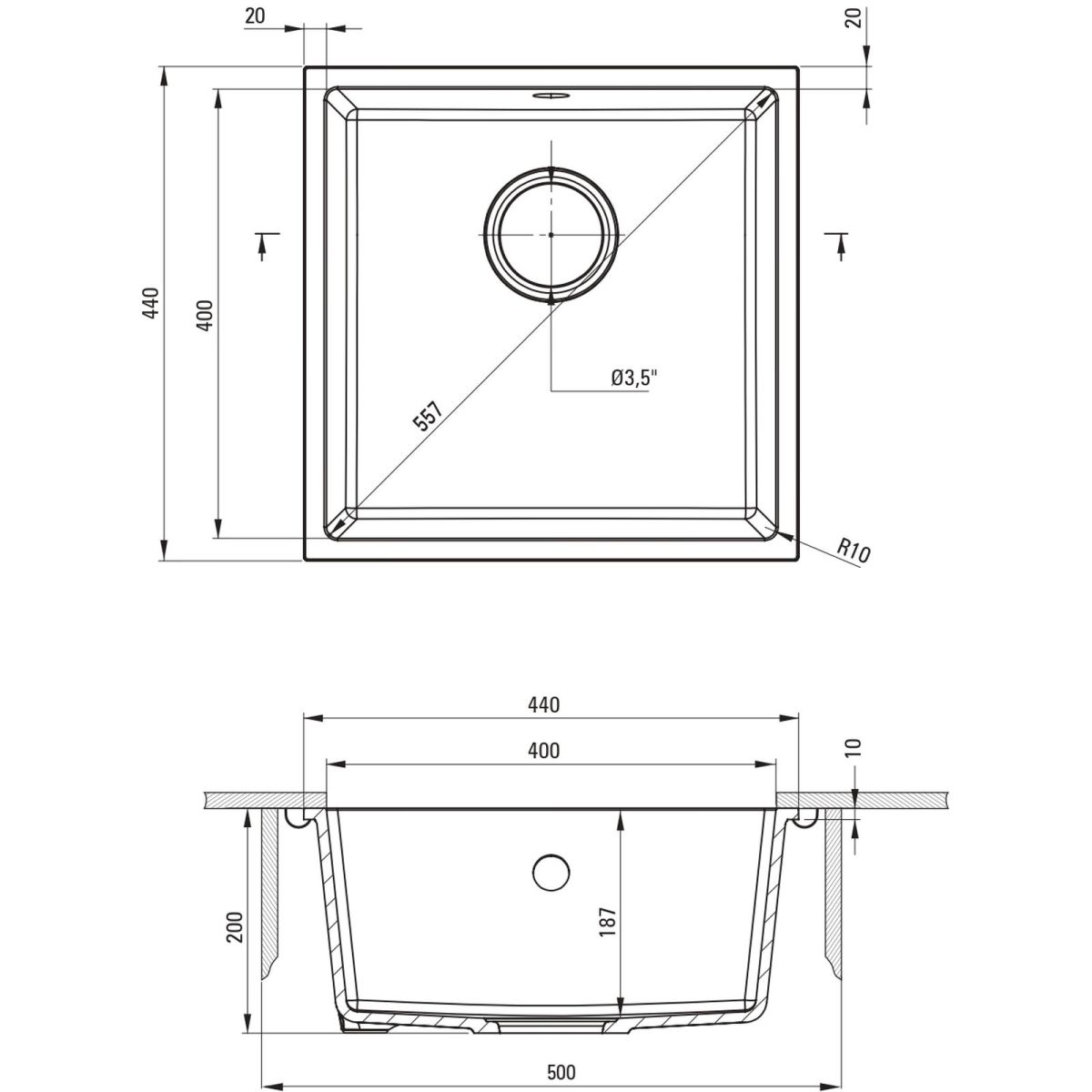 - Ausschnitt in der Arbeitsplatte [mm]: 400 x 400