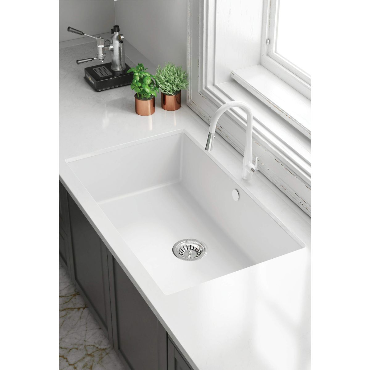 Die Einbeckenspüle Corda ist aus strapazierfähigem Granit gefertigt. Dieses Material zeichnet sich durch eine außergewöhnliche Widerstandsfähigkeit gegen Stöße, Temperaturschocks und Verfärbungen aus – gemäß der Norm PN-EN 13310. Die schöne Alabaster-Oberfläche passt sowohl in provenzalische als auch in moderne Küchen. Im Lieferumfang enthalten sind auch ein manueller Stöpsel und ein platzsparender Siphon Space-Saver. Deante bietet in seinem Sortiment auch einen Haken und eine Reling an, die perfekt zum Modell Corda passen.