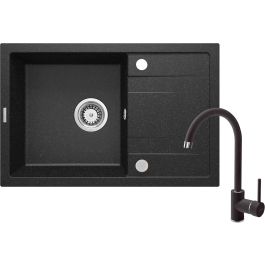 Die Corio-Spüle mit Wasserhahn ist ein perfekt abgestimmtes Set für ein modernes Badezimmer. Der Granit, aus dem das Set gefertigt ist, zeichnet sich durch eine außergewöhnliche Widerstandsfähigkeit gegen Stöße, Temperaturschocks und Verfärbungen aus – gemäß der Norm PN-EN 13310. Die hohe Armatur erleichtert die Arbeit in der Küche und ermöglicht das einfache Befüllen selbst sehr hoher Töpfe mit Wasser. Zusätzlich ist sie mit einem Belüfter ausgestattet, der den Wasserstrahl mit Luft anreichert und so den Wasserverbrauch deutlich reduziert. Das Ganze ist in einem eleganten Graphitfarbton gehalten.