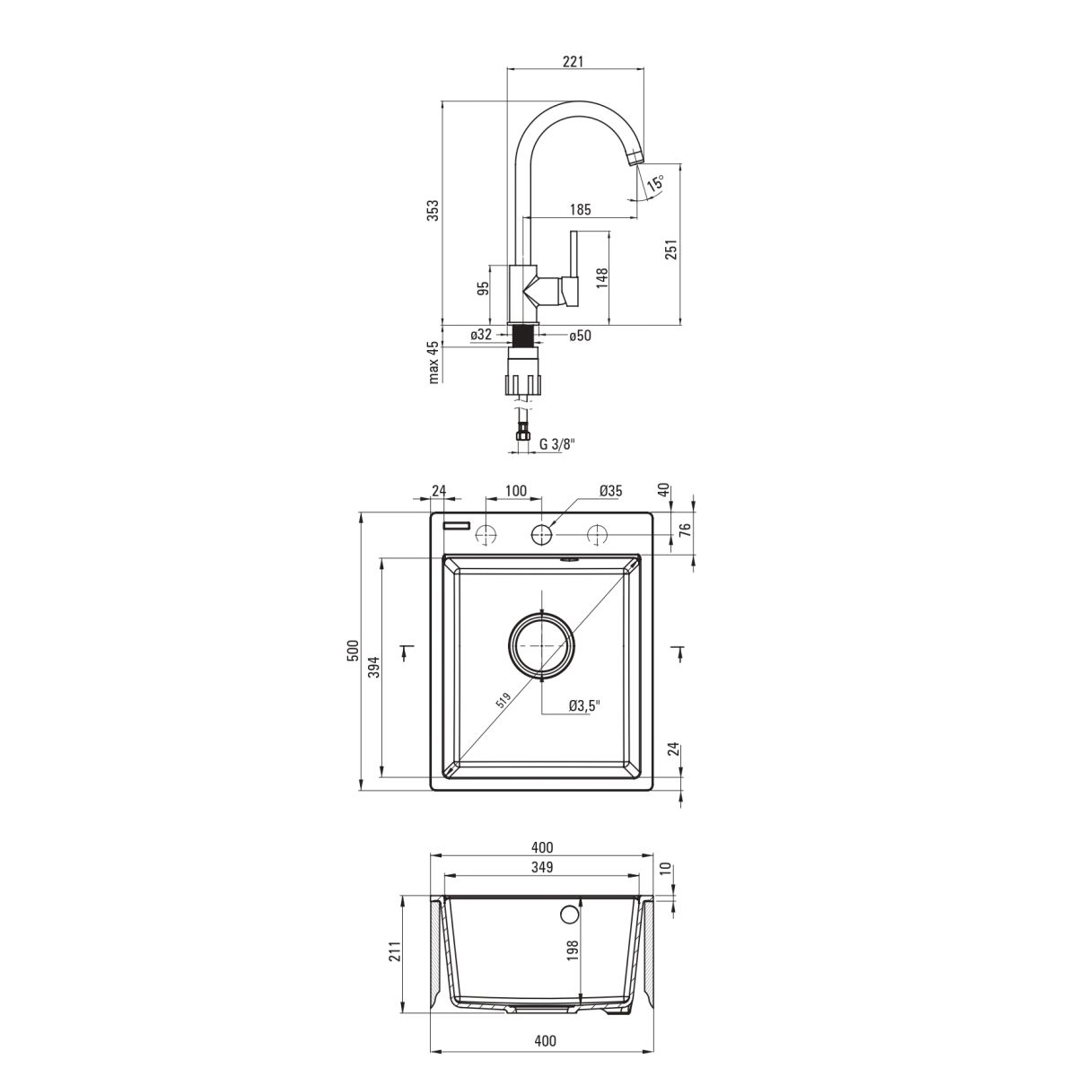 - Abflussdurchmesser: 3,5''