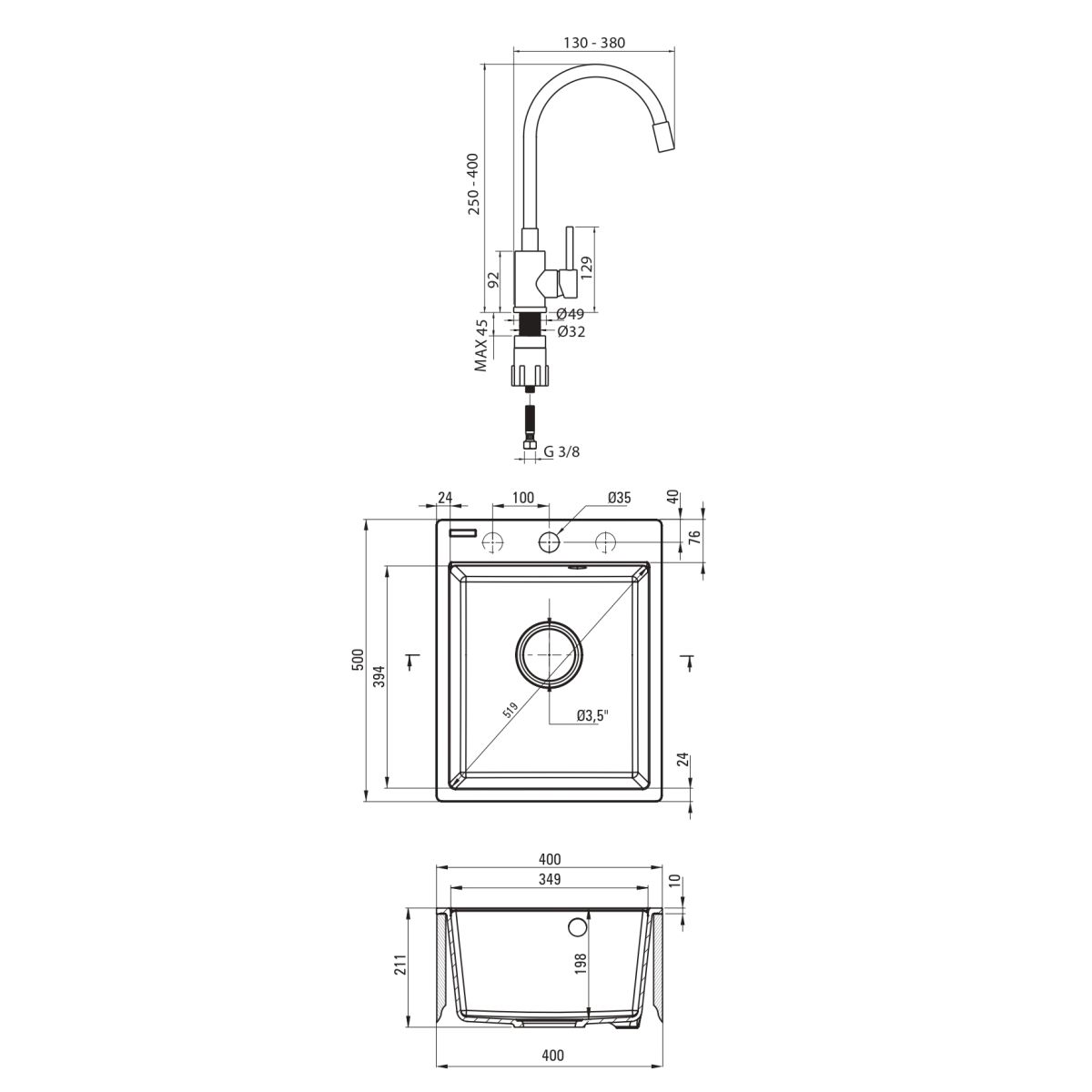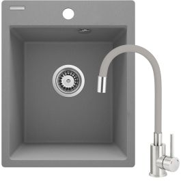 Das Set in einem eleganten Grauton ist eine Kombination aus Stil und Zuverlässigkeit. Die einteilige Granitspüle mit Abtropffläche aus einem Material, das der Norm PN-EN 13310 entspricht, zeichnet sich durch ihre Widerstandsfähigkeit gegen Stöße, Temperaturschocks und Verfärbungen aus. Dank seiner wasserabweisenden Eigenschaften bleibt kein Wasser auf der Oberfläche zurück, und Silberionen verleihen der Spüle antiseptische Eigenschaften und sorgen für Hygiene. Das Set enthält auch einen Space-Saver-Siphon, der Platz im Schrank spart und die Mülltrennung erleichtert. Zum Set gehört eine graue Armatur mit gebogenem Auslauf, die Komfort bietet und sich perfekt in moderne Innenräume einfügt.