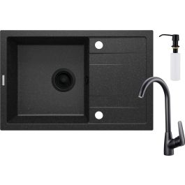 Das Set umfasst eine Granitspüle mit Zubehör, eine Küchenarmatur und einen Spülmittelspender. Wenn Sie ein fertiges Set kaufen, können Sie sicher sein, dass alles perfekt zusammenpasst. Die Spüle ist aus strapazierfähigem Granit gefertigt, der stoßfest und hitzebeständig ist. Die Armatur ist mit einem Belüfter für den Wasserstrahl und einem schwenkbaren Auslauf ausgestattet. Abgerundet wird das Ganze durch einen Spülmittelspender. Die Armatur und der Spender sind in elegantem Mattschwarz gehalten und passen hervorragend zum dunklen, graphitfarbenen Spülbecken. Das gesamte Set passt perfekt in eine moderne Küche, die Innovationen liebt und den Platz optimal nutzt.