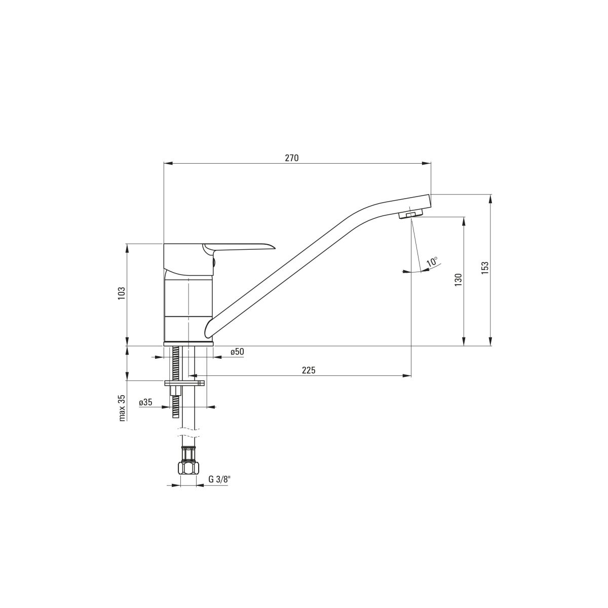 - Gewinde von der Installation: 3/8''