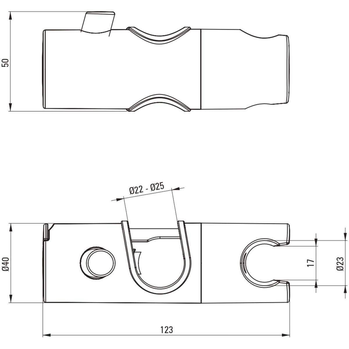 Die Halterung ist für eine Duschbrause vorgesehen und wird an einer Stange montiert. Im Lieferumfang sind Adapter für verschiedene Stangendurchmesser enthalten. Die Halterung ist in glänzendem Matt ausgeführt.