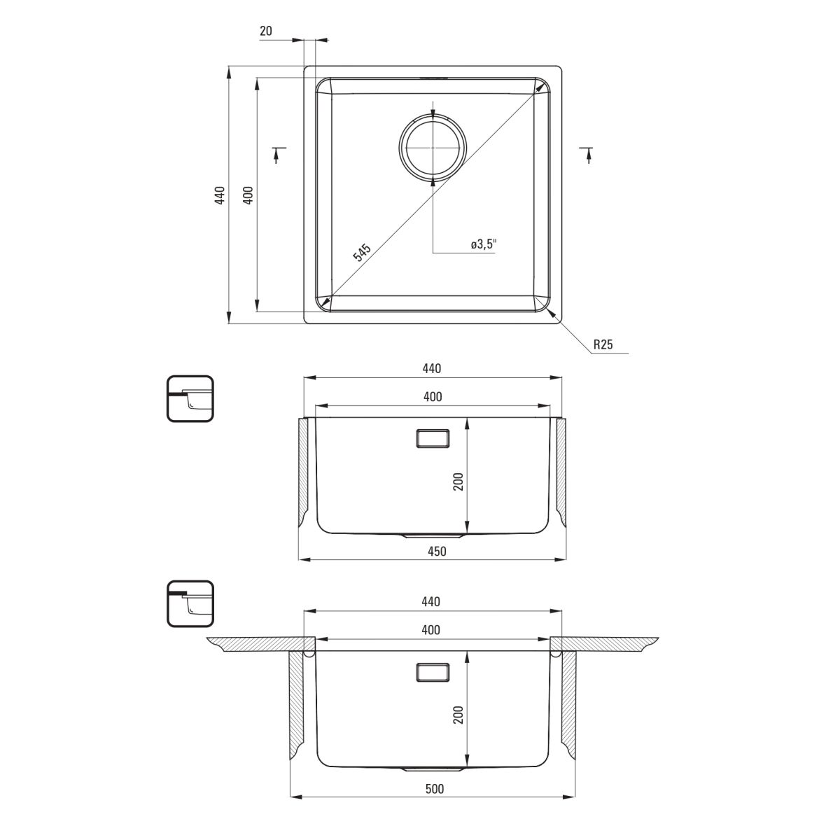 - Ausschnitt in der Arbeitsplatte (Hängeversion) [mm]: 400 x 400