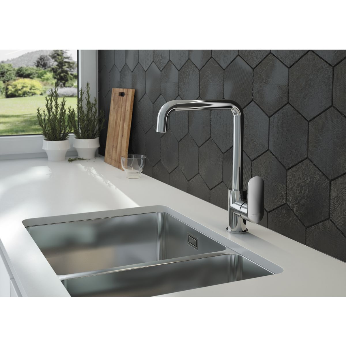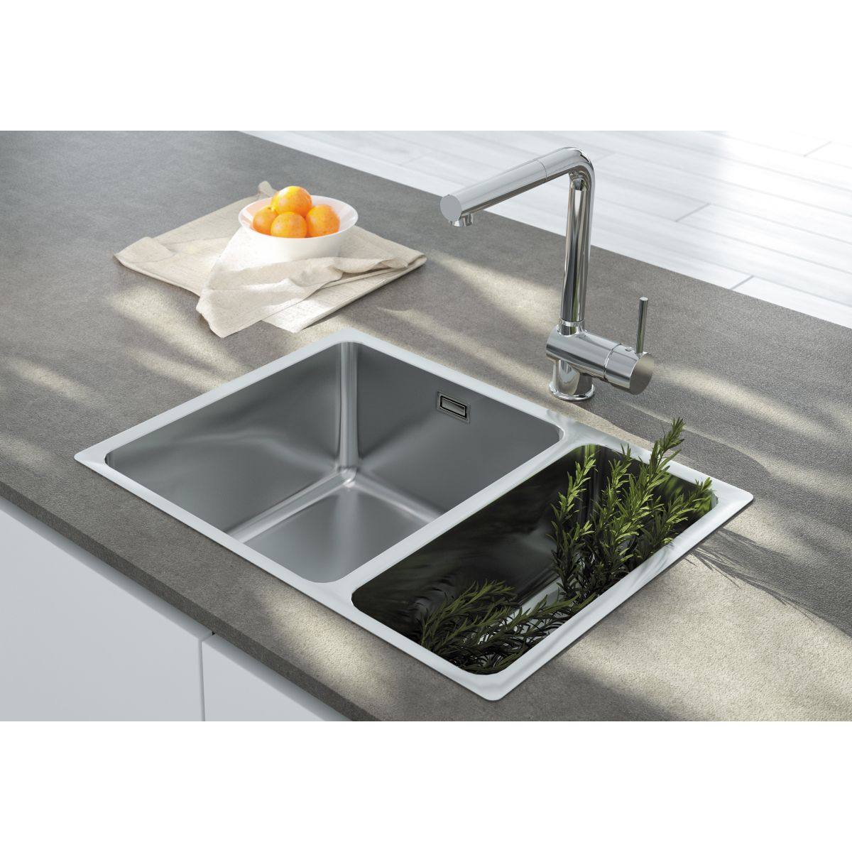 Die Spüle EGERIA ist aus hochwertigem Stahl mit antiseptischen Eigenschaften gefertigt. Es handelt sich um ein Modell mit einer großen und einer zweiten, kleineren, aber äußerst praktischen Kammer. Diese dient zum Waschen von Obst und Gemüse oder zum Auftauen von Lebensmitteln. Die satinierte Oberfläche sorgt für ein elegantes und ästhetisches Erscheinungsbild in der Küche. Die Spüle wird mit einem automatischen Stöpsel und einem platzsparenden Siphon geliefert, der Platz im Schrank spart.