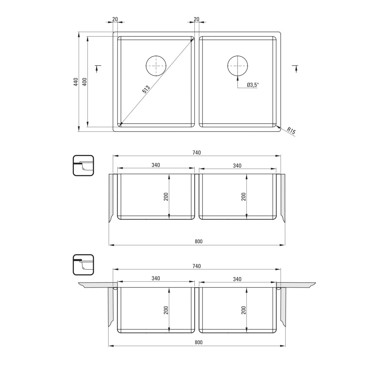 - Ausschnitt in der Arbeitsplatte (eingelassen) [mm]: 720 x 420