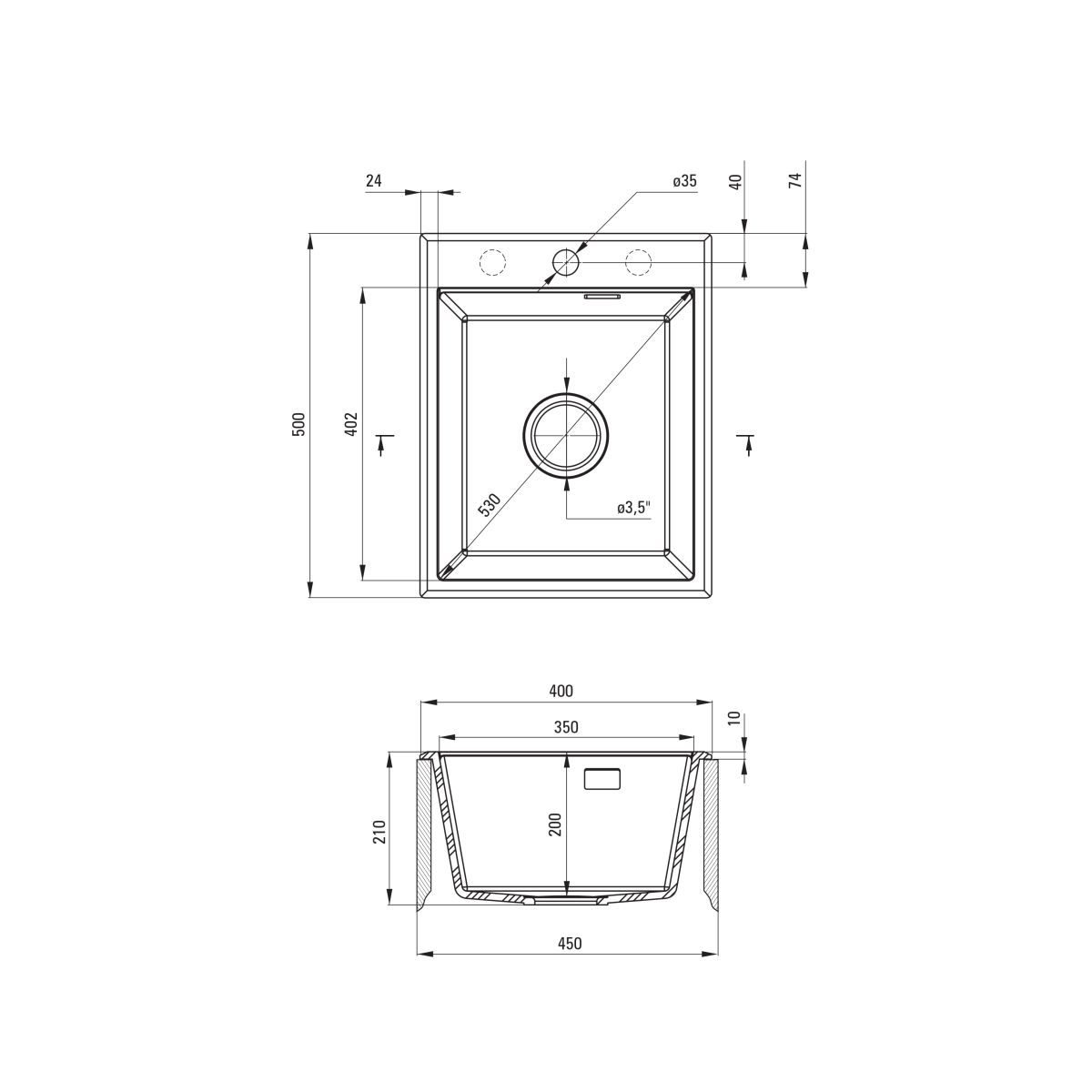 - Durchmesser des Abflusses: 3,5''