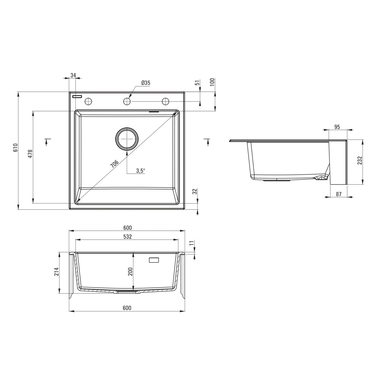 - Durchmesser des Abflusses: 3,5''
