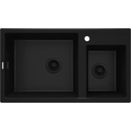 Die Granit-Spüle Eridan mit zwei Becken zeichnet sich durch viele praktische und langlebige Eigenschaften aus, die sich aus der Verwendung von hochwertigem Naturmaterial ergeben. Die Oberfläche ist gemäß der Norm EN 13310 nicht nur stoßfest, abriebfest (entfernen), farbbeständig und hitzebeständig (bis zu 250 °C), sondern weist auch Flüssigkeitspartikel ab, sodass die Spüle sauber bleibt. Darüber hinaus nimmt die Granitoberfläche keine Gerüche an, ist temperaturwechselbeständig und bleibt länger sauber. Die Spüle Eridan in einer praktischen Version mit zwei Becken – einem größeren und einem kleineren – in tiefem, elegantem Schwarz eignet sich perfekt für Küchen, die in einem modernen, minimalistischen Loft-Stil eingerichtet sind. Die Spüle verfügt über eine werkseitige Öffnung für die Armatur und eine zusätzliche gefräste Öffnung für die Montage eines automatischen Stopfens, einen Überlauf und eine automatische Ablaufabsperrung. Im Lieferumfang enthalten ist auch ein Spacesaver-Siphon mit Anschlussmöglichkeit für eine Spülmaschine, der so konzipiert ist, dass er bis zu 50 % weniger Platz als herkömmliche Siphons benötigt.