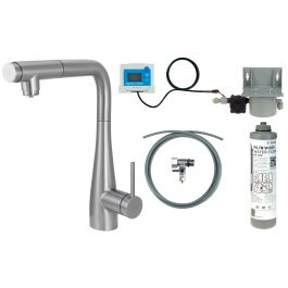 Die Küchenarmatur mit dem Wasserfiltersystem Eridan ist eine einzigartige Lösung, die Eleganz, Funktionalität und Gesundheitsbewusstsein vereint. Die schlanke Form der Armatur mit gebürsteter Stahloberfläche verleiht der Küche einen einzigartigen Charakter. Der sich nach unten hin subtil verbreiternde Körper lässt das Ganze leicht und harmonisch wirken. Es ist jedoch mehr als nur eine Armatur – dank des eingebauten Filtersystems wird Eridan zu einer Quelle für sauberes und gesundes Wasser. Ein Druck auf den Click-Knopf am Auslauf genügt, um mit einem Handgriff auf gefiltertes Wasser umzuschalten, das über einen separaten Schlauch direkt aus dem Filter zugeführt wird. Diese Lösung macht nicht nur zusätzliche Krüge oder Flaschen überflüssig, sondern schont auch die Umwelt, indem sie den Verbrauch von Plastik reduziert. Das mitgelieferte Filterset entfernt effektiv Chlor, Schwermetalle, Sand und andere Verunreinigungen und verbessert so den Geschmack und Geruch des Wassers. So können Sie es bedenkenlos Ihrer Familie servieren, zum Kochen oder zur Zubereitung von Getränken verwenden. Ein praktischer Monitor zeigt an, wann der Filterwechsel fällig ist, was eine gleichbleibende Wasserqualität im Alltag garantiert. Die Installation des gesamten Systems ist schnell und einfach, die tägliche Nutzung intuitiv und bequem. Eridan ist nicht nur ein elegantes Element Ihrer Küchenausstattung, sondern vor allem eine Investition in Gesundheit und Komfort. Es verbindet moderne Ästhetik mit einem ökologischen Ansatz und Liebe zum Detail und macht Ihre Küche zu einem noch funktionaleren und einzigartigeren Ort.