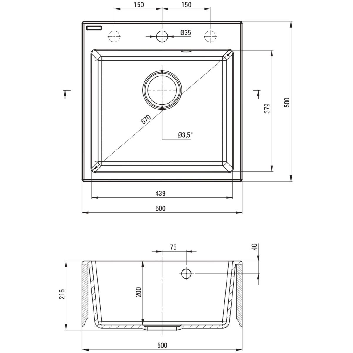 - Durchmesser des Abflusses: 3,5''