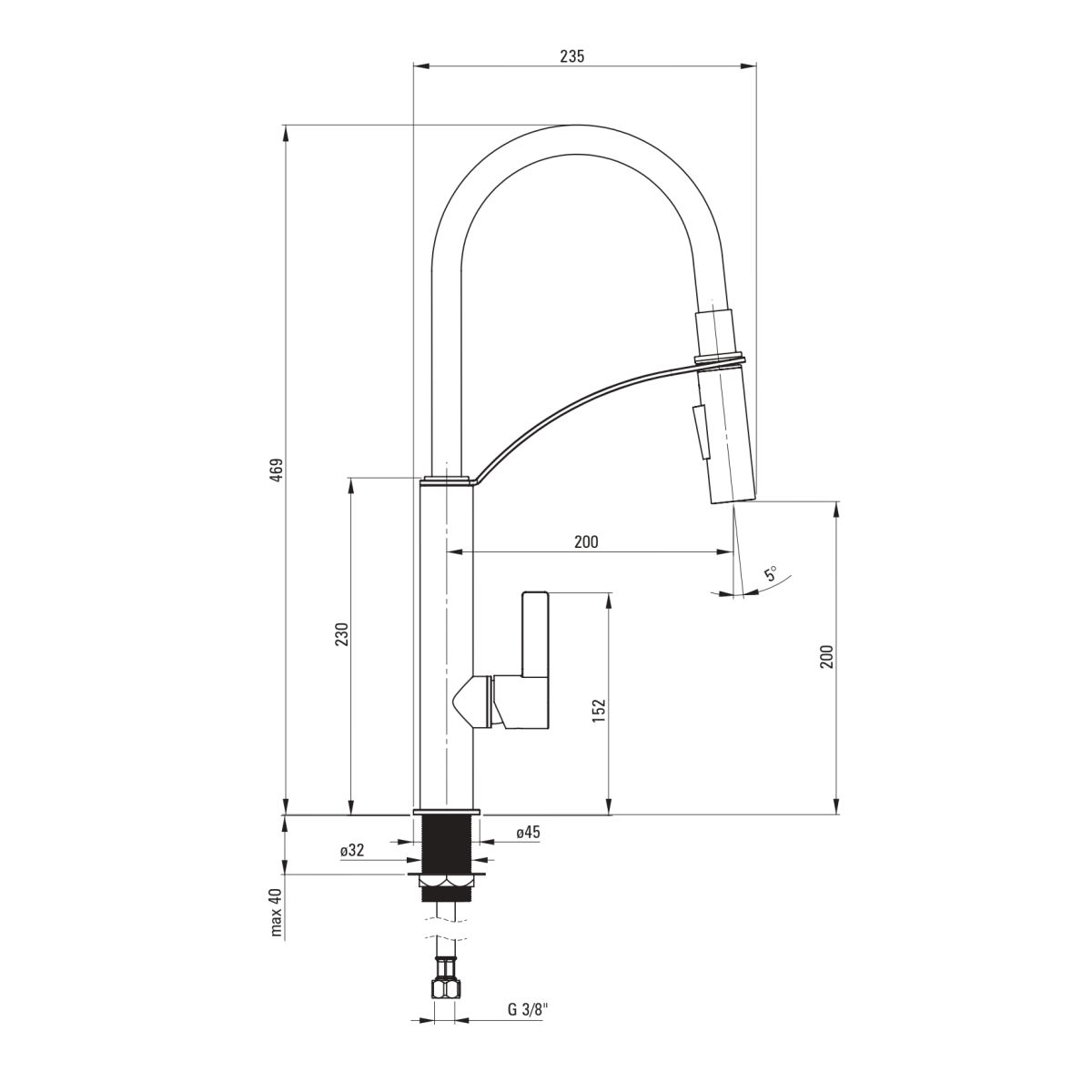 - Gewinde von der Installation: 3/8''