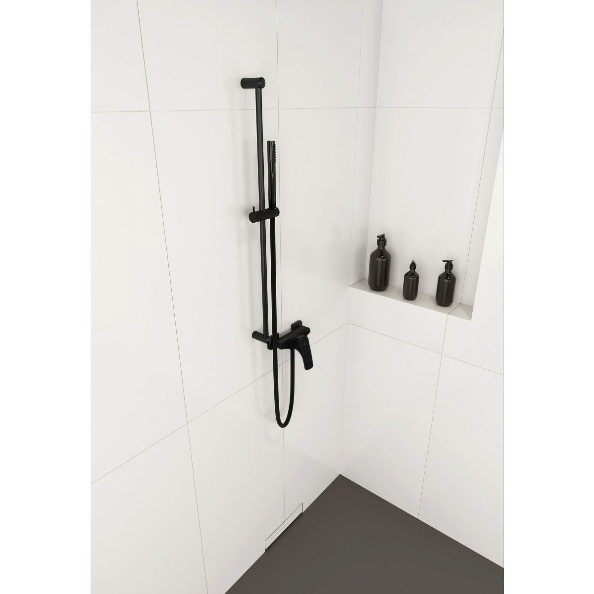 Die Wand-Duscharmatur Hiacynt in auffälligem, mattem Schwarz ist Teil einer eleganten und minimalistischen Kollektion, mit der Sie Ihr gesamtes Badezimmer in einem einheitlichen, modernen Stil einrichten können. Die sanft abgerundeten Formen der Kollektion sind zeitlos und wurden so gestaltet, dass sie den verfügbaren Platz im Badezimmer optimal ausnutzen. Die hier vorgestellte Armatur mit einer dauerhaften schwarzen Beschichtung und satiniertem Finish ist ein mutiger Akzent, der sich perfekt in ein minimalistisches Badezimmerdesign sowie in einen Loft- oder skandinavischen Stil einfügt. Die Armatur hat die für die Kollektion typische Form, die geschwungene Bögen mit geraden Flächen kombiniert, und passt perfekt zu weißen und grauen Fliesen oder solchen, die Holz oder Stein imitieren.