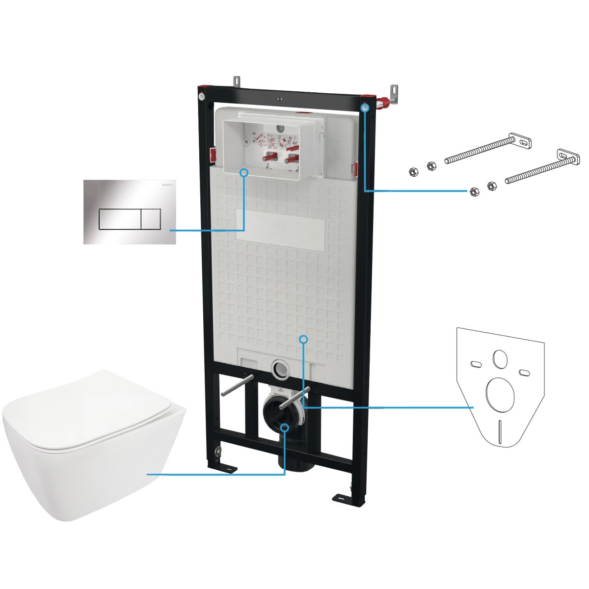 Das Unterputz-WC-Set wird auf einem Rahmen für Wand-WC-Becken montiert. Darüber hinaus umfasst das Set einen Soft-Close-Sitz, einen verchromten Spülknopf und eine Dämmmatte. Die Toilettenschüssel ohne Standardflansch ist ideal für die Sauberhaltung, da sie keine unnötigen Ecken und Kanten aufweist. Der innovative Unterputzrahmen sorgt für die Stabilität der gesamten Konstruktion, während die Akustikunterlage Geräusche dämpft. Die Dämmmatte gleicht Unebenheiten zwischen Fliese und Toilettenschüssel aus. Das Gesamtbild ist sehr ästhetisch und elegant.