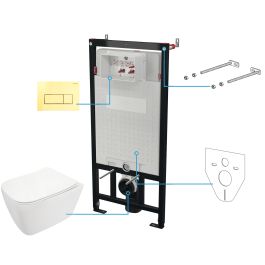 Das Unterputz-WC-Set besteht aus einem innovativen Rahmen, einem goldenen Spülknopf, einer hängenden randlosen Toilettenschüssel mit Sitz und einer Dämmmatte. Die Reinigung wird durch den schnell abnehmbaren Sitz und die Toilettenschüssel ohne Standardrand, die keine Kanten und Ecken aufweist, erleichtert. Die Akustikmatte gleicht Unebenheiten zwischen Fliese und WC-Becken aus, und der langsam fallende Sitz verbessert den Komfort. Das Ganze ist sehr stabil und ästhetisch.