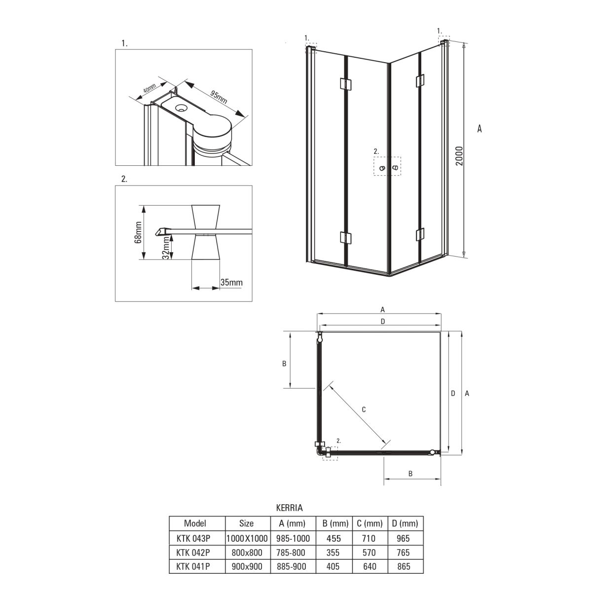 Die Duschkabine Kerria besteht aus transparentem, 6 mm starkem Hartglas. Sie ist mit einer Active-Cover-Beschichtung versehen, die die Reinigung des Produkts erleichtert. Die Kabine kann mit oder ohne Duschwanne direkt auf den Fliesen montiert werden. Die Kabine ist mit einem Soft-Close-System ausgestattet. Im Lieferumfang sind Profile enthalten, die Unebenheiten der Wände ausgleichen.