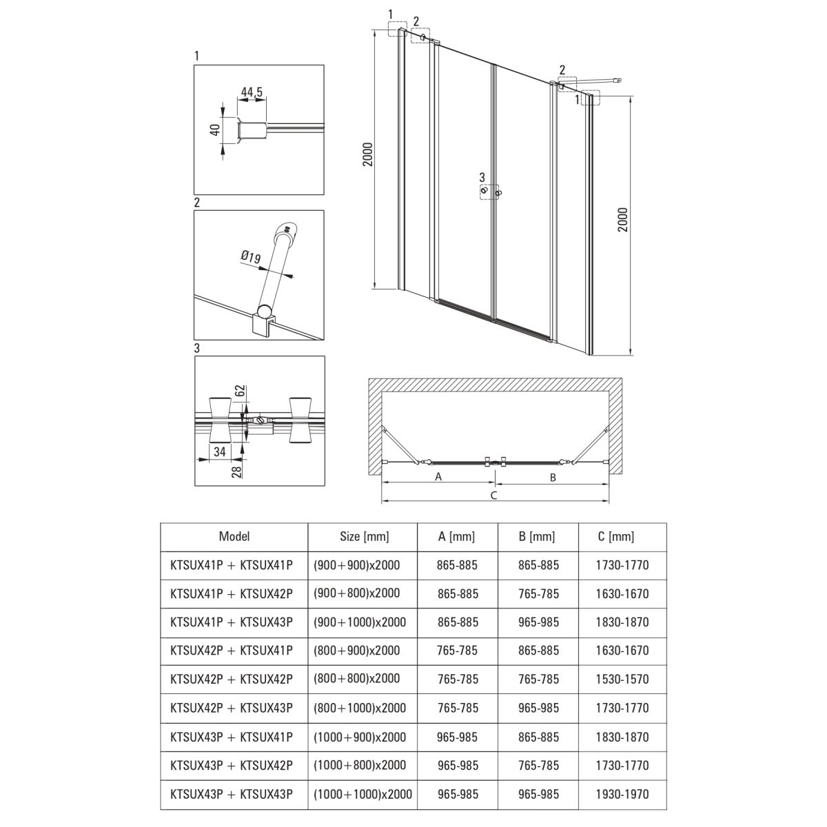 Es besteht die Möglichkeit, eine Duschkabine nach dem Prinzip Tür-Tür oder Tür-Wand zu kombinieren. Alle Produkte müssen aus einer Produktserie stammen. Die Kombinationen sind in der Galerie dargestellt.