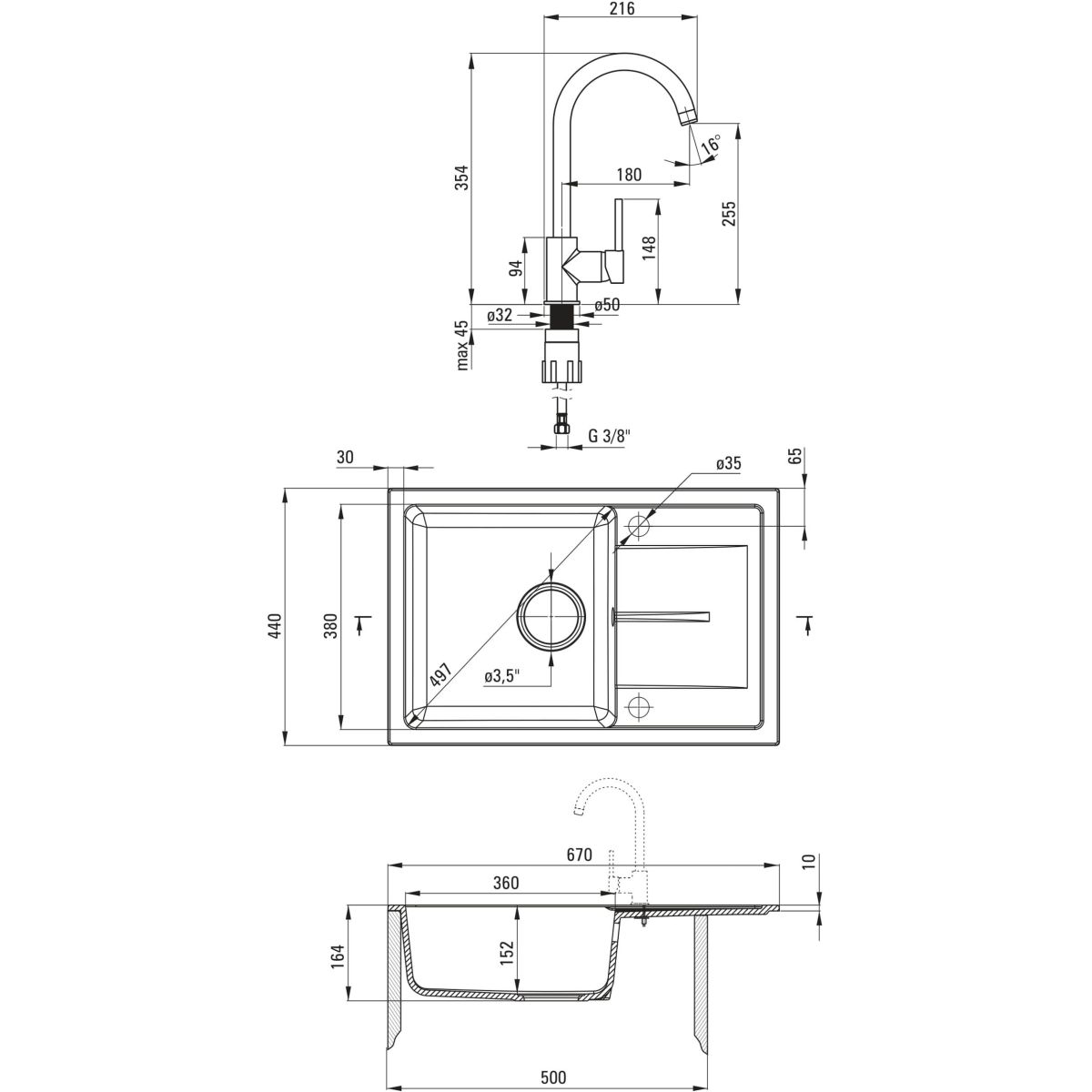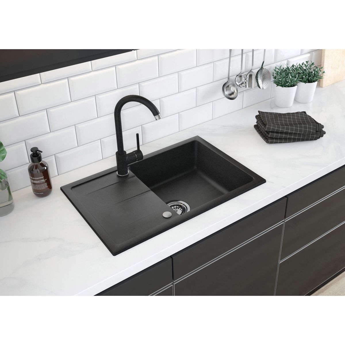 Die Spüle Leda mit Wasserhahn ist für moderne Küchen bestimmt. Der Granit, aus dem die Spüle gefertigt ist, zeichnet sich durch eine außergewöhnliche Widerstandsfähigkeit gegen Stöße, Temperaturschocks und Verfärbungen aus – gemäß der Norm PN-EN 13310. Die hohe Armatur erleichtert das Befüllen selbst großer Gefäße mit Wasser. Sie ist mit einem Belüfter für den Wasserstrahl und einem schwenkbaren Auslauf ausgestattet. Wenn Sie das Set kaufen, können Sie sicher sein, dass alles perfekt zusammenpasst. Im Angebot sind ein Haken für den Schwamm und eine Reling für das Geschirrtuch erhältlich, die perfekt zum Spülbecken Leda passen.