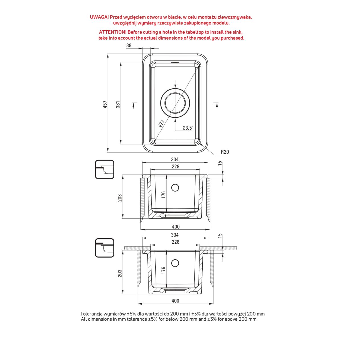 - ACHTUNG! Bevor Sie eine Öffnung in die Arbeitsplatte schneiden, um die Spüle einzubauen, berücksichtigen Sie bitte die tatsächlichen Abmessungen des gekauften Modells.