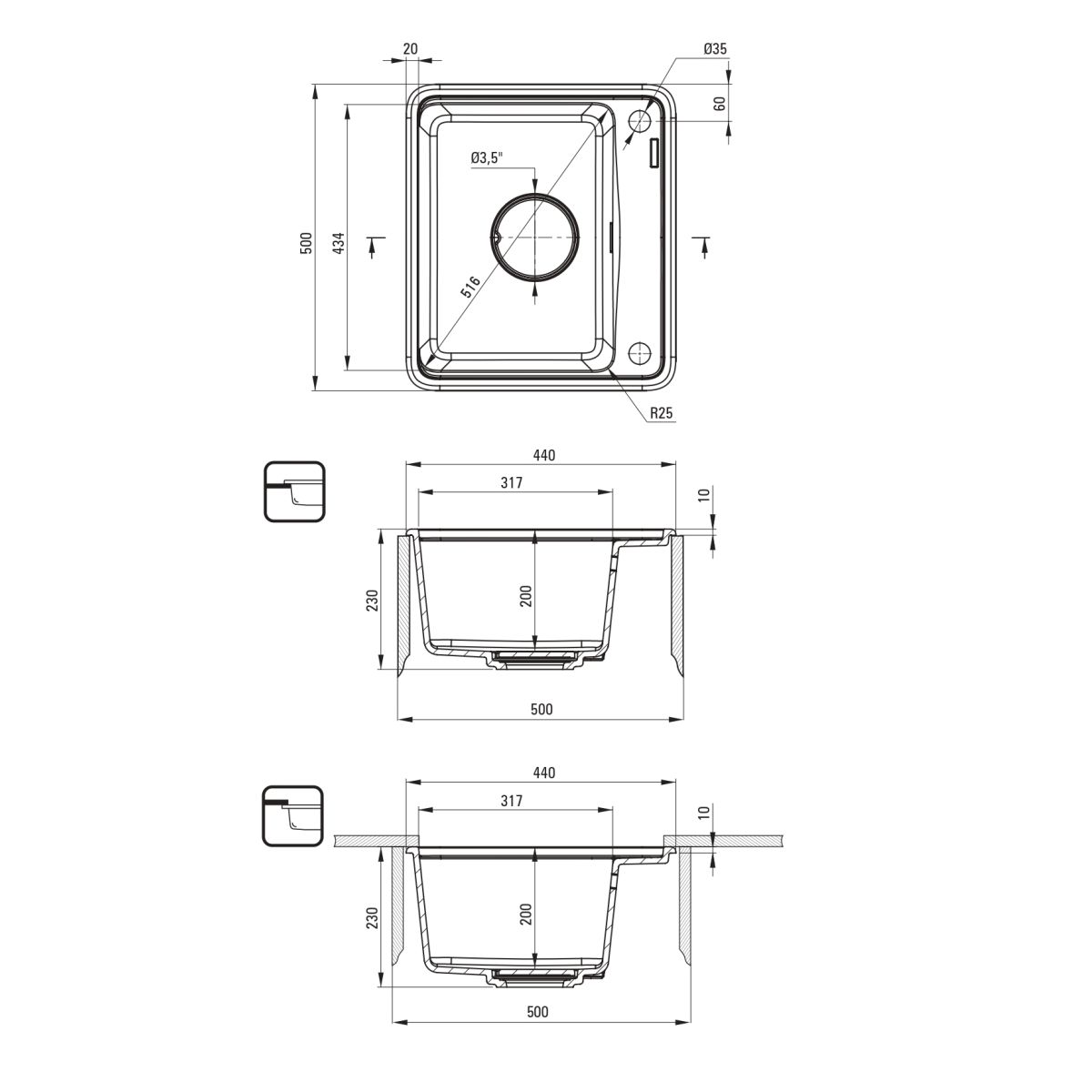 - Ausschnitt in der Arbeitsplatte (hängend): 46 x 40 cm