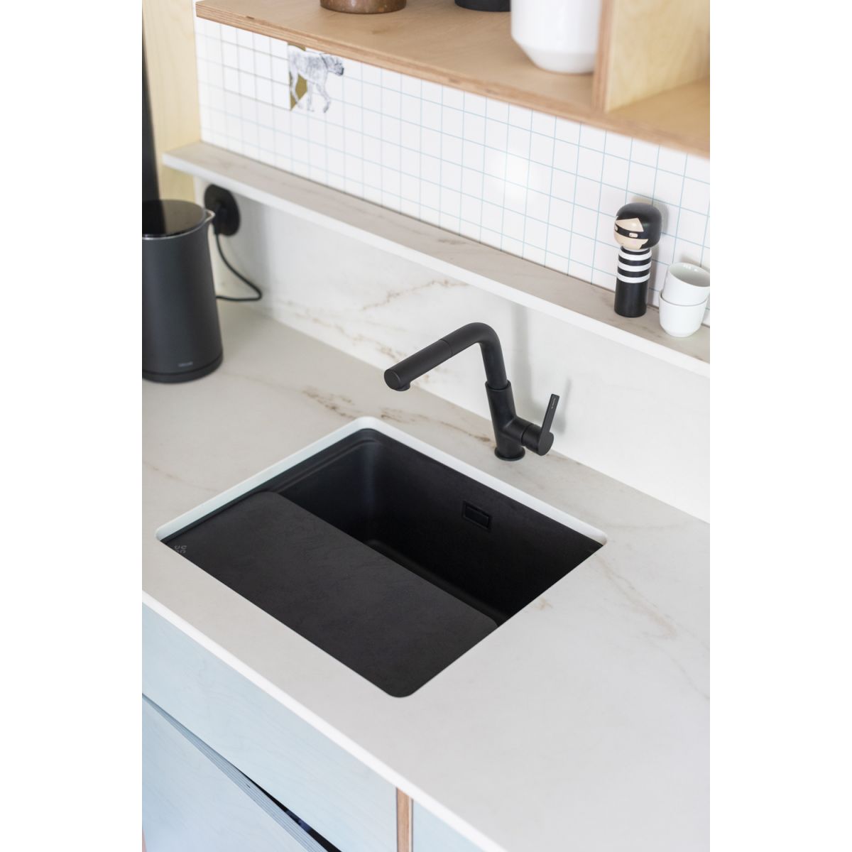 Die Spüle Momi ist die perfekte Kombination aus Eleganz, Funktionalität und Stil. Dieses Modell mit einer Kammer sieht nicht nur gut aus, sondern erfüllt auch praktische Anforderungen in der Küche. Ein wichtiges Element ist die elegante Abdeckung aus Granit, die das Sieb perfekt verdeckt. Dank des automatischen Click-Stopfens lässt sich der Abfluss mit einem Klick leicht öffnen und schließen. Momi ist auch eine praktische Arbeitsstation, die eine bequeme Zubereitung von Mahlzeiten ermöglicht, da alle notwendigen Utensilien griffbereit sind. Mit seiner tiefschwarzen Oberfläche verleiht er Eleganz und Raffinesse.