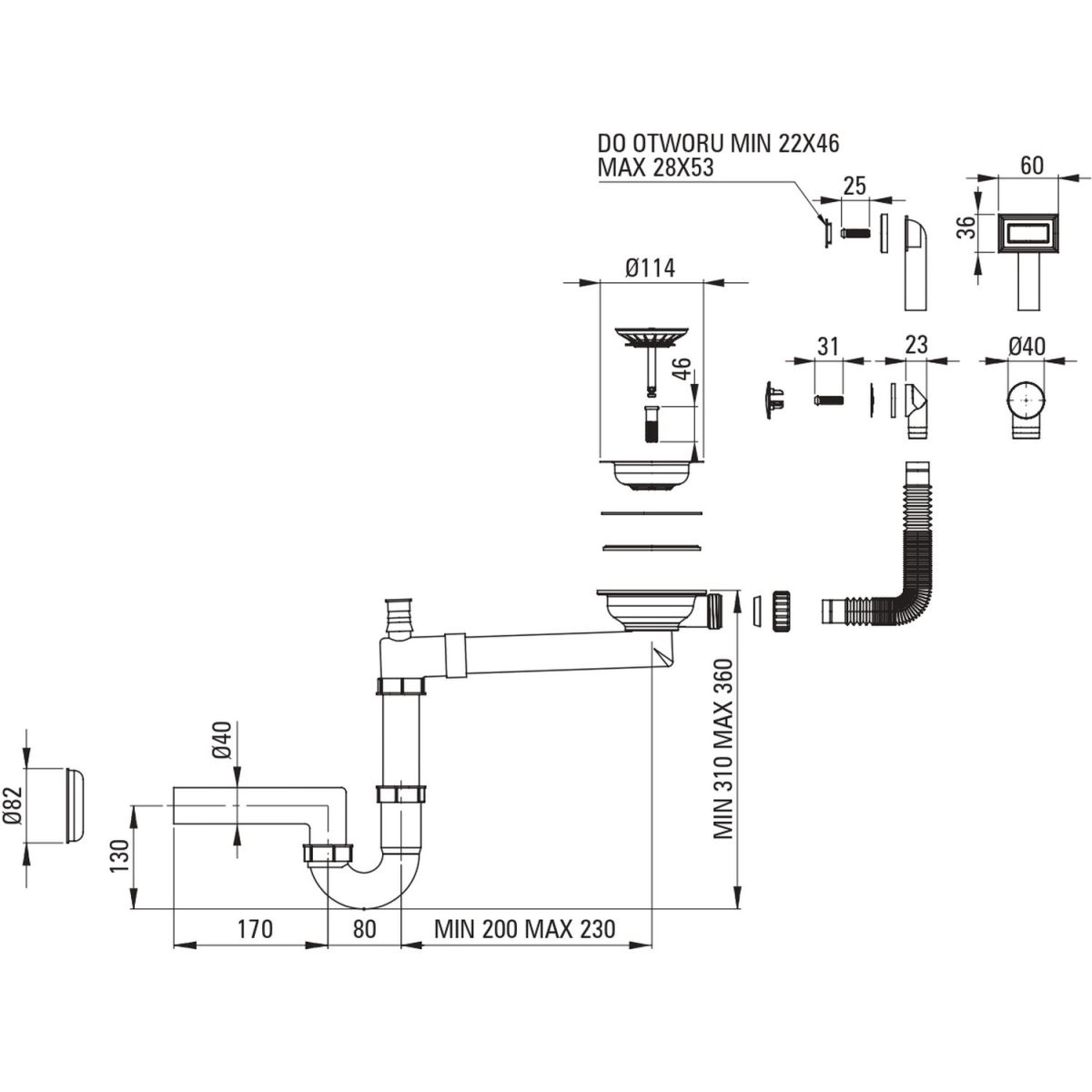 - Platzsparender Siphon, der unter anderem die Mülltrennung erleichtert