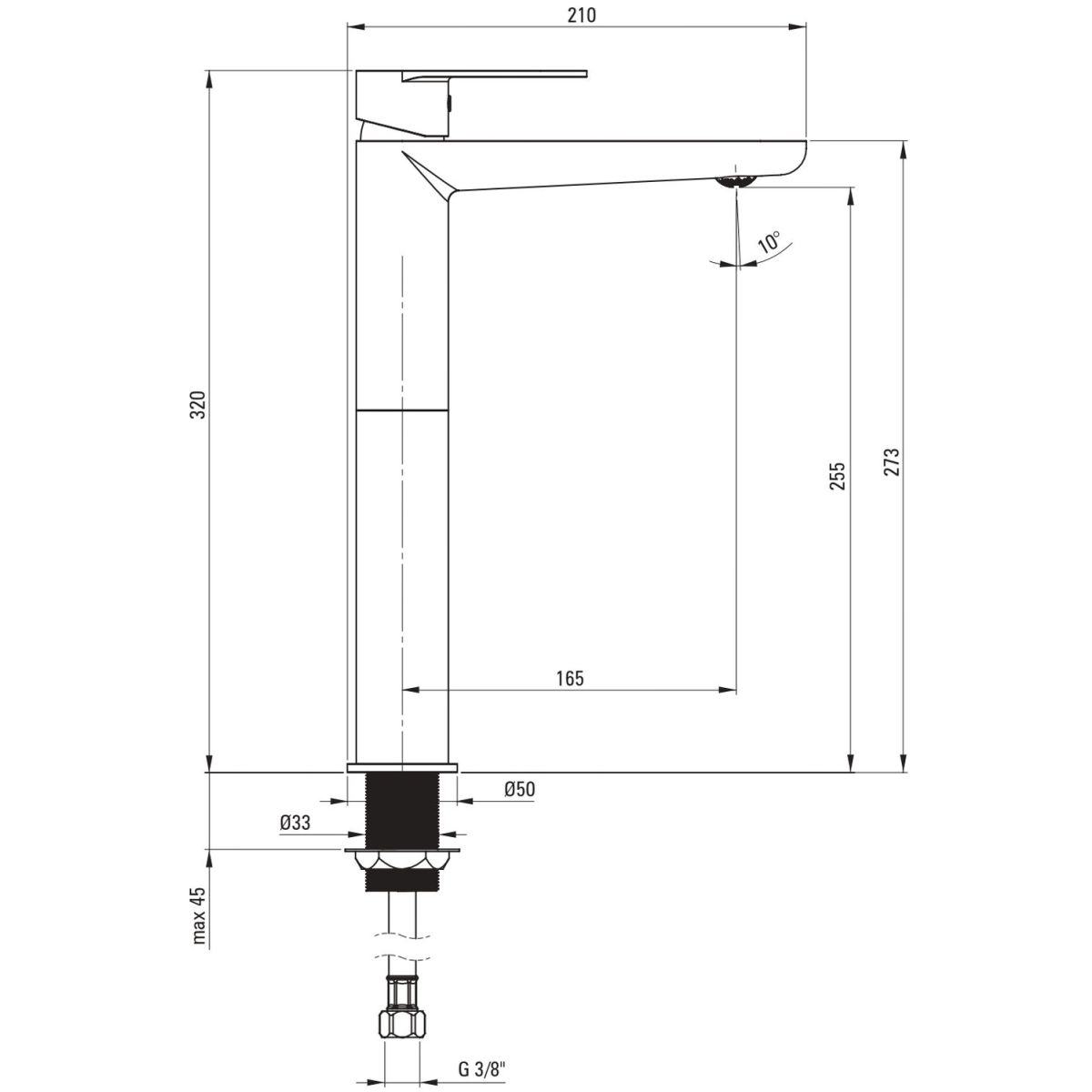 - Gewinde von der Installation: 3/8''