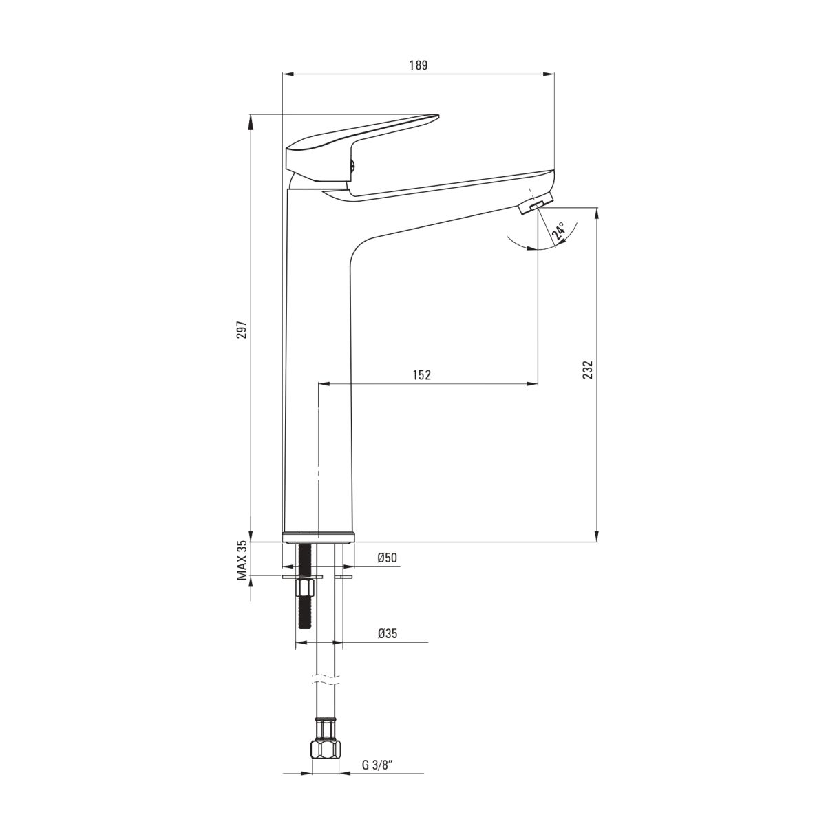 - Gewinde von der Installation: 3/8''