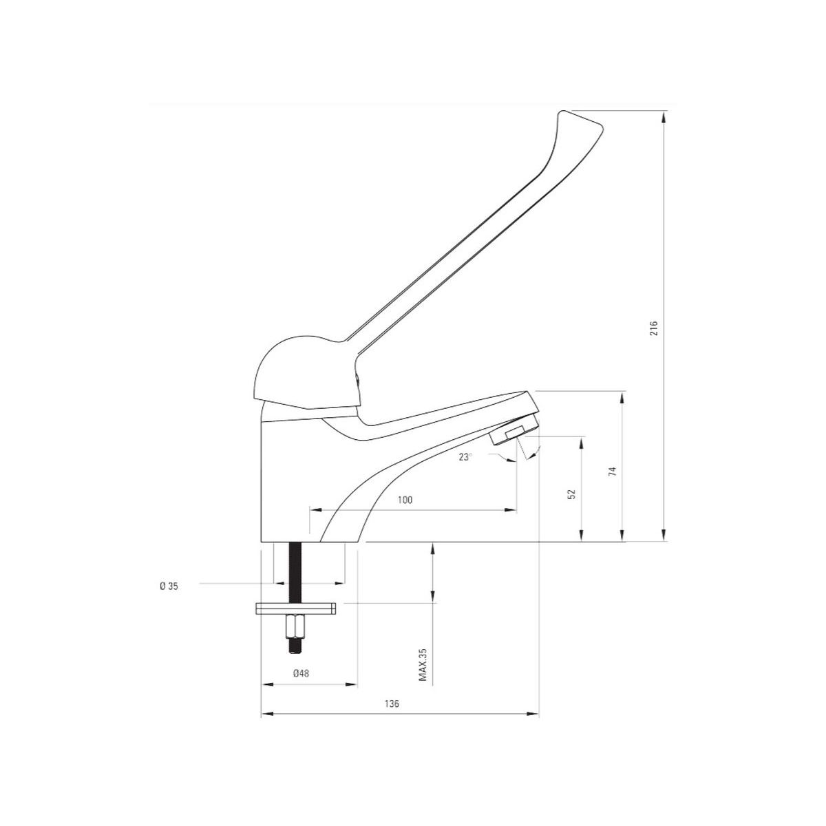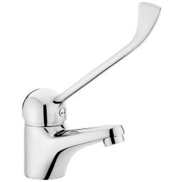 An Orten, an denen es nicht möglich ist, das Wasser mit einem herkömmlichen Griff zu öffnen und zu schließen, ist ein Wasserhahn mit einem speziellen verlängerten Hebel nützlich, der es ermöglicht, diese Manöver beispielsweise mit dem Ellbogen auszuführen. Dadurch wird der Berührungskontakt mit dem Wasserhahn minimiert.