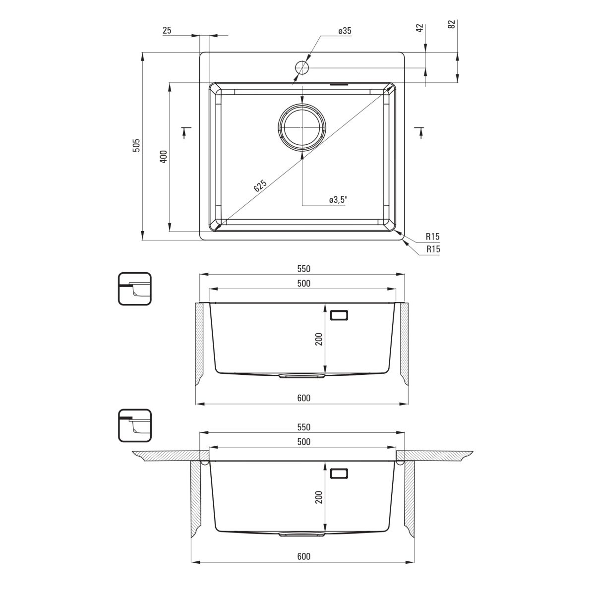 - Ausschnitt in der Arbeitsplatte (eingelassen) [mm]: 530 x 485