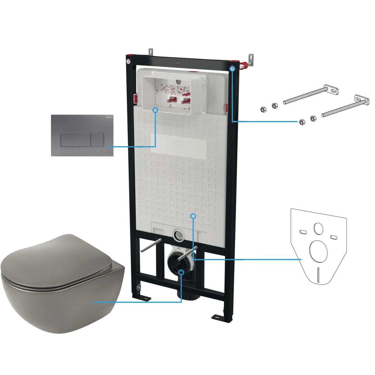 Das 6-in-1-Set aus der Peonia-Kollektion ist eine hervorragende Wahl für alle, die auf der Suche nach ästhetischen und einzigartigen Badausstattungen sind. Es umfasst eine Keramik-Toilettenschüssel in eleganter Titaniumfarbe, die sich durch eine randlose Konstruktion auszeichnet, wodurch sie besonders leicht zu reinigen ist. Das Set enthält außerdem einen dünnen Toilettensitz, der sanft abfällt und für zusätzliche Eleganz sorgt. Das minimalistische Design harmoniert perfekt mit den übrigen Elementen des Sets, und die passende Spültaste in Titaniumfarbe rundet das Ganze ab. Darüber hinaus ermöglicht die innovative Konstruktion der Schüssel einen sparsameren Wasserverbrauch beim Spülen. Durch die Montage der Toilettenschüssel an der Wand mit Hilfe eines Unterputz-Rahmens, der Teil des Sets ist, gewinnt das Badezimmer an Platz und Ästhetik.