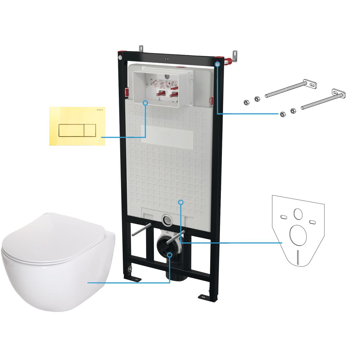 Das WC-Set für die Unterputzmontage besteht aus der Toilettenschüssel Peonia mit Sitz, einem Unterputzrahmen für Wandtoiletten und einem Spülknopf in Goldoptik. Die flanschlose Toilettenschüssel Peonia hat abgerundete Formen, keine Kanten und Ecken, was die Reinigung erheblich erleichtert. Die Toilettenschüssel wird mit einem Softclose-Sitz geliefert. Der Rahmen verfügt über eine leise Doppelspülung – klein (3 l) und groß (6 l). Der Knopf in Goldoptik verleiht dem Badezimmer einen Hauch von Extravaganz, und dank seiner flachen Konstruktion schmiegt er sich perfekt an die Wand an.
