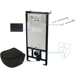 Das Unterputz-WC-Set besteht aus einem schwarzen Bedienknopf, einer randlosen Schüssel mit Soft-Close-Sitz und einer Dämmmatte. Die Toilettenschüssel hat keinen Rand und keine unnötigen Ecken und Kanten, in denen sich Schmutz ansammeln könnte. Ihre einzigartige schwarze Oberfläche wird Liebhaber extravaganter Innenräume begeistern. Darüber hinaus erhöht die Akustikunterlage den Bedienkomfort, während die Dämmmatte Unebenheiten zwischen Fliese und Toilettenschüssel ausgleicht. Das Ganze wird durch einen Stahlrahmen stabilisiert. Das Set sieht sehr ästhetisch und elegant aus.