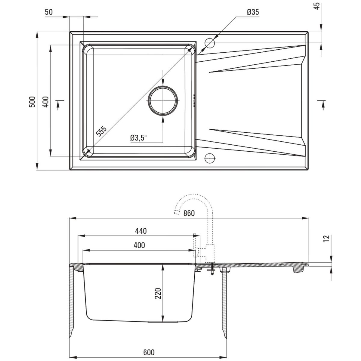 - Durchmesser des Abflusses: 3,5''