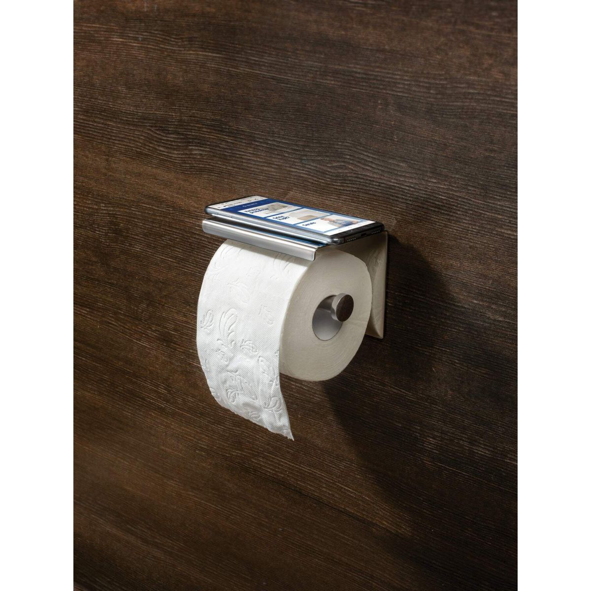 Der Papierhalter mit Ablage stammt aus der Round-Kollektion. Er verfügt über eine äußerst praktische Ablage, auf der Sie Ihr Telefon oder Ihre Brille ablegen können. Durch sein universelles Design und die glänzende Chromoberfläche passt der Halter in jedes Interieur.