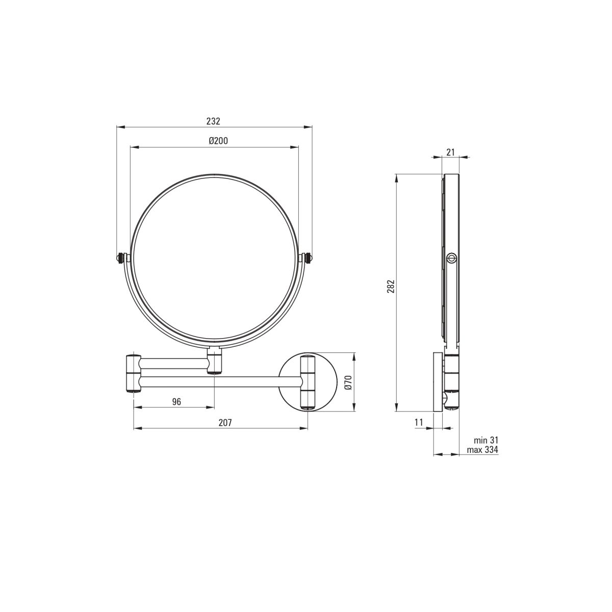 Der Kosmetikspiegel stammt aus der Serie Round und ist für die Wandmontage vorgesehen. Der lange, bewegliche Arm ermöglicht eine beliebige Ausrichtung des Spiegels. Der Spiegel ist doppelseitig, wobei eine Seite das Bild um das Dreifache vergrößert. Der Spiegel ist in glänzendem, elegantem Chrom gehalten und passt perfekt zu anderen Accessoires aus der Serie Round.