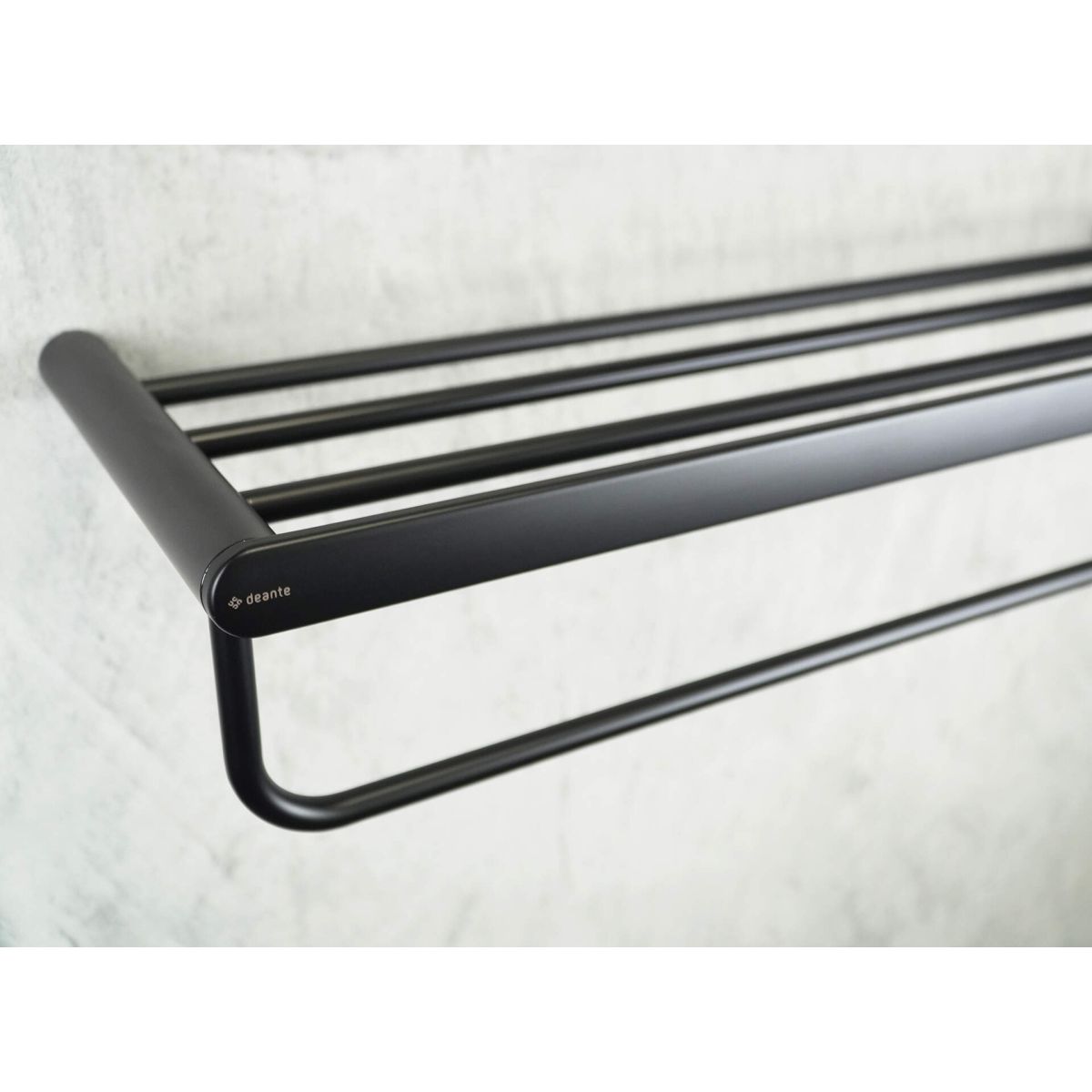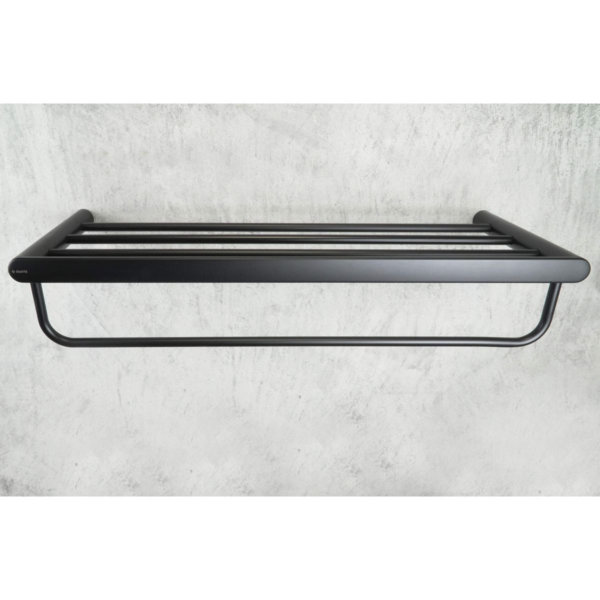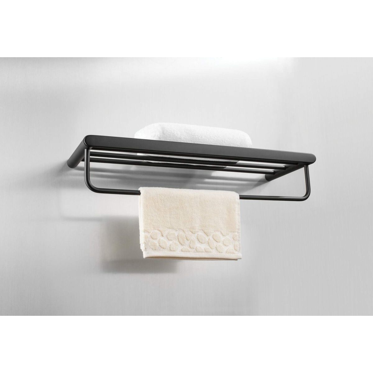 Das Regal aus Stahl stammt aus der Round-Kollektion. Dank seines universellen Designs und seiner eleganten Ausführung in mattem Schwarz passt das Regal zu fast jedem Interieur. Das Accessoire ist so konstruiert, dass es mehrere Handtücher aufnehmen kann.
