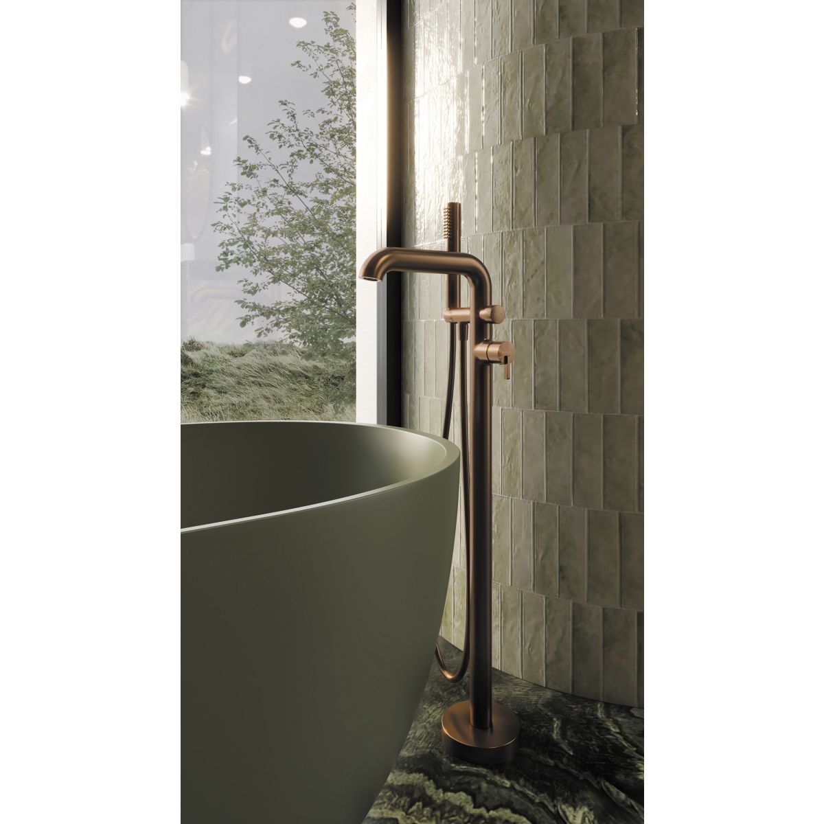 Die Silia-Säulenarmatur ist eine moderne Lösung für freistehende Badewannen. Ausgestattet mit einem Silikon-Luftsprudler, einem Schlauch mit Anti-Twist-System und einer Handbrause mit sanftem Regenstrom sorgt sie für Komfort und Benutzerfreundlichkeit. Der robuste Messingkörper und der Keramikkopf garantieren Langlebigkeit und Zuverlässigkeit des Produkts über viele Jahre hinweg. Der einstellbare Neigungswinkel der Handbrause und der präzise Keramik-Funktionsschalter unterstreichen die Funktionalität dieses Modells. Die Armatur zeichnet sich durch eine einzigartige Oberfläche in eleganter gebürsteter Bronzefarbe aus, die dem Innenraum einen unverwechselbaren und gemütlichen Charakter verleiht.